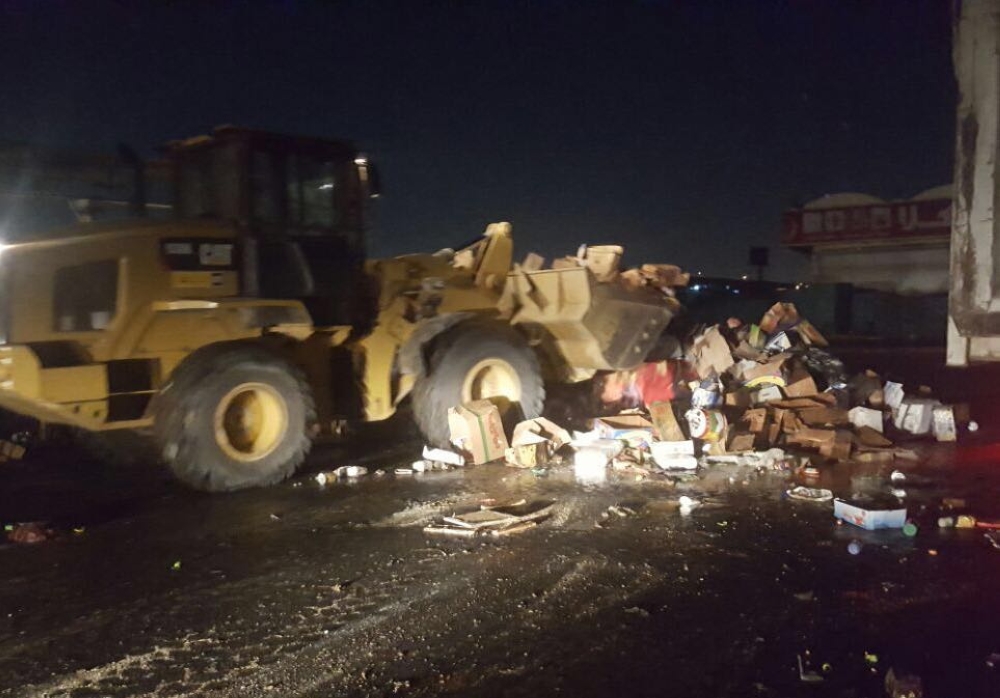 معدات الأمانة تتلف المواد الغذائية الفاسدة في سوق الصواريخ. (عكاظ)
