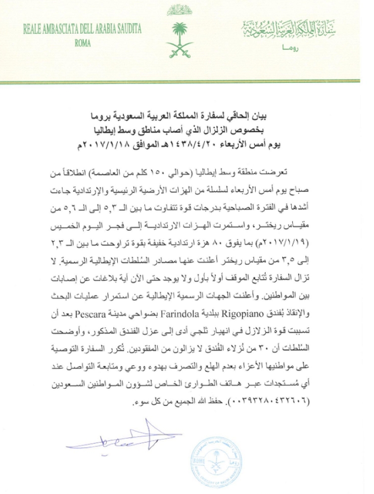 أكدت سفارة المملكة في روما، أنها لم تتلقى أية بلاغات عن إصابات بين المواطنين السعوديين، جراء الهزات الأرضية الرئيسية والارتدادية التي تعرضت لها منطقة وسط إيطاليا يوم أمس (الأربعاء).