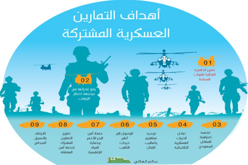 تواصل السعودية التمارين التدريبية العسكرية المشتركة مع الدول الشقيقة والصديقة للرفع من الجاهزية القتالية لقواتها، وتعزيز قدراتها في مواجهة أخطار وتحديات المنطقة ولجم أطماع النظام الإيراني ووضع حد لمساعيه للعبث بأمن المنطقة، ومكافحة الإرهاب، وجسّدت هذه التمارين احترافية المقاتل السعودي وما يتمتع به من إمكانات وقدرات وجاهزية قتالية عالية. وتأتي مشاركة السعودية في هذه التمارين منذ سنوات عديدة بناء على الأهداف المحددة والمرسومة للرفع من جاهزية وإمكانات القوات المسلحة والقوات البرية السعودية في إطار السعي المستمر لتكون القوات على أهبة الاستعداد لمواجهة أي تحديات أو أخطار.