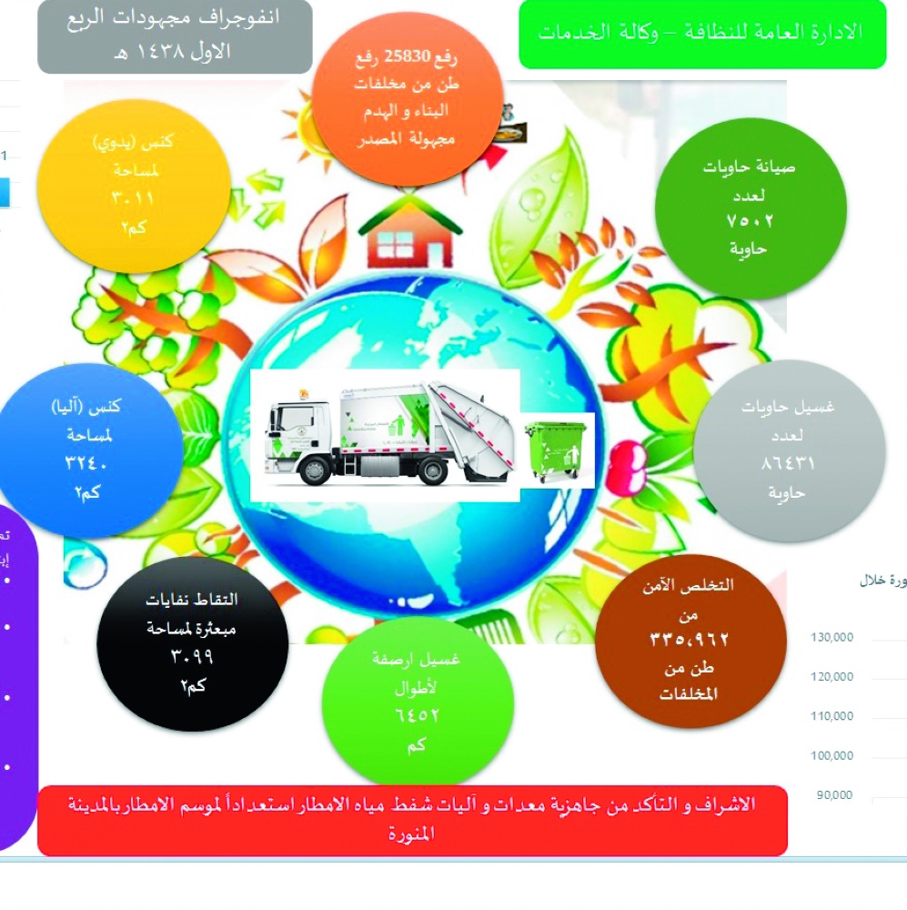 ويعمل بمشروع النظافة 3055 عاملا و411 معدة، وتم كنس مساحة 3011 كيلومترا مربعا يدويا، و3240 كيلومترا مربعا آليا، وجمعت جثث 256 حيوانا نافقا، وبلغت مخلفات المسالخ 4605 أطنان، والمخلفات الطبية 525 طنا.