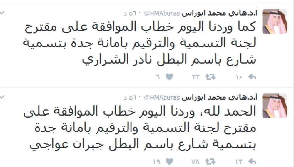 وقال "أبو راس" عبر حسابه في "تويتر": "الحمد لله، وردنا اليوم خطاب الموافقة على مقترح لجنة التسمية والترقيم بأمانة جدة بتسمية شارع باسم البطل "جبران عواجي"، وتسمية شارع آخر باسم البطل نادر الشراري".
