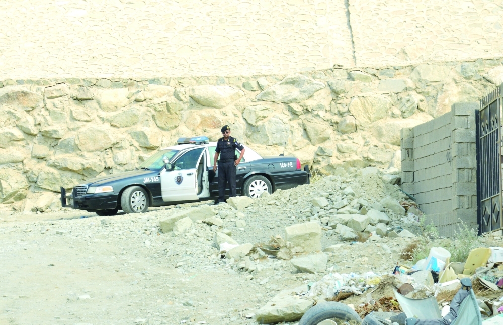 دورية أمنية خلال تواجدها في محيط الاستراحة التي استأجرها الإرهابيان في الحرازات. (تصوير: موسى الأحمري)