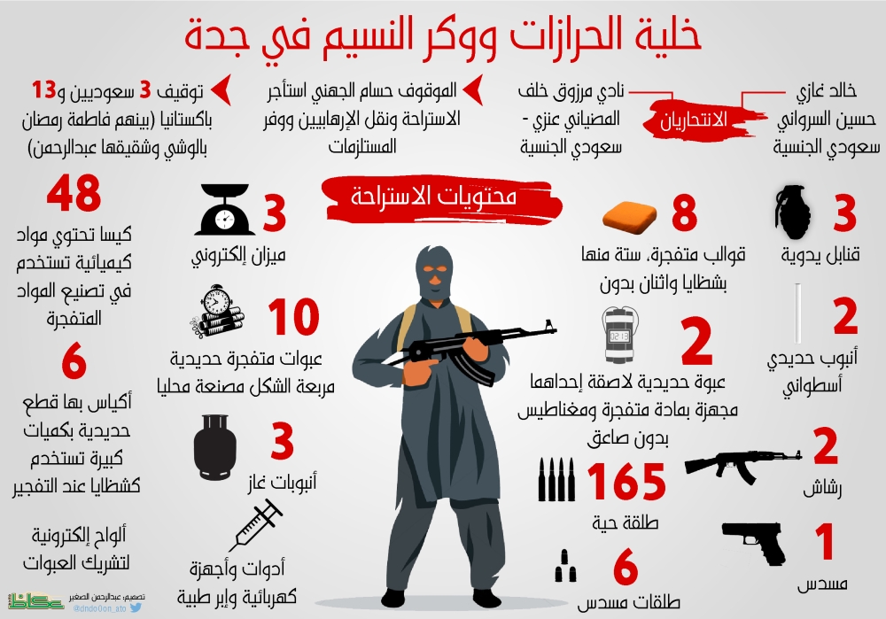 أعلنت وزارة الداخلية أمس (الثلاثاء) هوية الإرهابيين الانتحاريين اللذين فجرا نفسيهما في استراحة بحي الحرازات شرقي جدة، إذ تبين أنهما خالد غازي حسين السرواني، ونادي مرزوق خلف المضياني عنزي - سعوديا الجنسية -، وقد تأكّد من الفحوص المخبرية للأشلاء البشرية المرفوعة من الاستراحة عدم وجود أشخاص آخرين فيها خلافهما، مؤكدة إيقاف 16 شخصا على ذمة قضية وكري استراحة الحرازات وشقة النسيم (وسط جدة) 3 منهم سعوديو الجنسية والبقية من الجنسية الباكستانية.