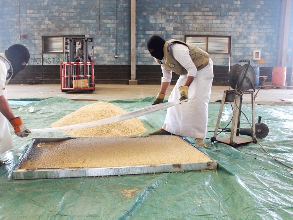 وبمداهمة المستودع عُثر على حاوية تبين أن بداخلها مصنع متحرك لإنتاج قوالب الثلج، وبداخلها صناديق نحاسية مخبأ بها كمية من الحبوب المخدرة بلغت (2.300.000) حبة، وتم ضبط مستقبلي الكمية وهم خمسة أشخاص من جنسيات مختلفة, ولازالت المتابعة مستمرة للوصول لأعوان الخلية خارج المملكة.