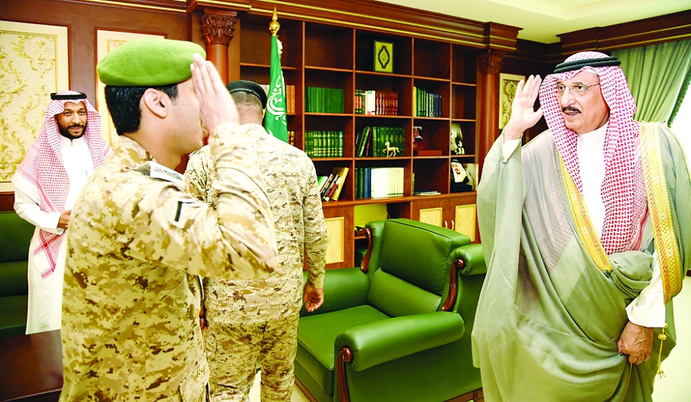 الأمير محمد بن ناصر متلقيا تحية أحد الجنود الإعلاميين. (عكاظ)