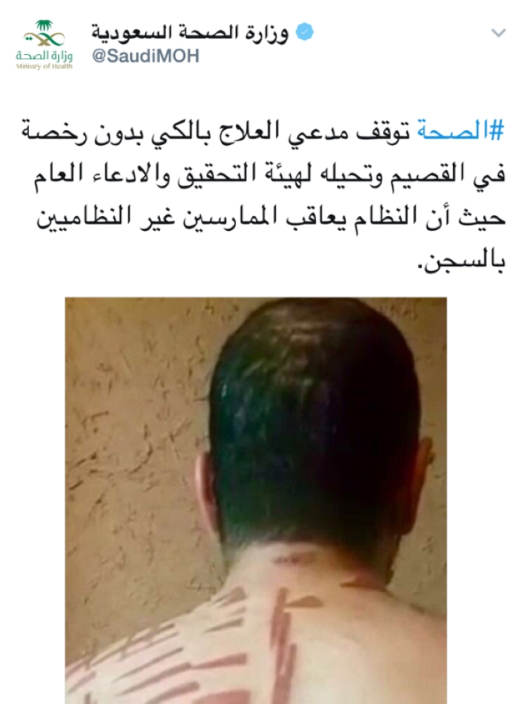 وقالت الوزارة عبر حسابها الرسمي في "تويتر": "الصحة توقف مدعي العلاج بالكي بدون رخصة في القصيم وتحيله لهيئة التحقيق والادعاء العام، حيث أن النظام يعاقب الممارسين غير النظاميين بالسجن".