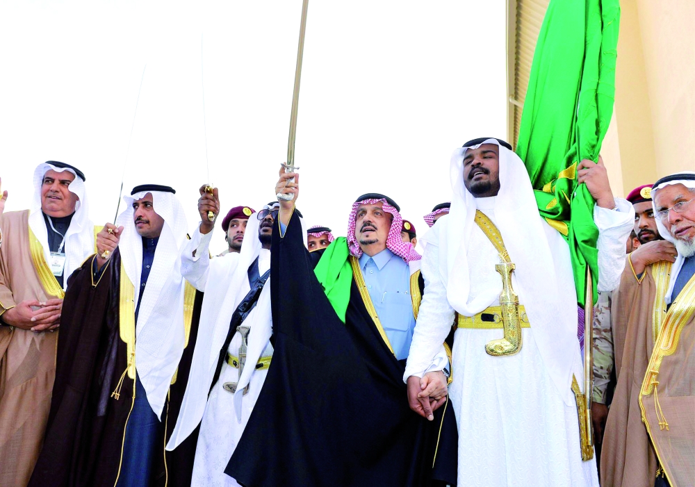 الأمير فيصل بن بندر يشارك في العرضة خلال حفلة أهالي الزلفي. (عكاظ)