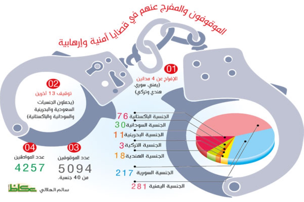 أفرجت وزارة الداخلية عن أربعة مدانين (يمني، سوري، هندي وتركي) في قضايا أمنية تمس الأمن الوطني بعد انتهاء محكوميتهم المقررة شرعا. فيما أوقفت 13 آخرين متهمين بقيامهم بأدوار إجرامية (يحملون الجنسيات السعودية والبحرينية والسودانية والباكستانية) ووفق الكشوفات الإحصائية المحدثة الصادرة من وزارة الداخلية في «نافذة تواصل» ارتفع عدد الموقوفين في القضايا الإرهابية والأمنية بسجون المباحث العامة إلى 5094 موقوفا من 40 جنسية.واطلعت «عكاظ» على بيانات الموقوفين إذ لوحظ ارتفاع في عدد الموقوفين من أربع جنسيات، حيث كان عدد المواطنين في الأسبوع الماضي 4254 موقوفا ليرتفع بزيادة ثلاثة ليصبح حاليا 4257 موقوفا، فيما زاد موقوف واحد في عدد الموقوفين لكل من الجنسيتين البحرينية من 10 اشخاص إلى 11 موقوفا، والسودانية من 29 إلى 30، فيما كان للجنسية الباكستانية العدد الأكبر بزيادة ثمانية موقوفين ليصبح عددهم من 68 إلى 76 موقوفا، خصوصا بعد العمل الإرهابي الذي وقع في محافظة جدة أخيرا.