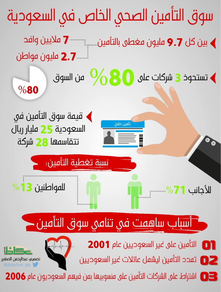 وقدرت قيمة سوق التأمين الصحي الخاص في السعودية بـ25 مليار ريال، تتقاسمها 28 شركة حالياً، وشهدت السوق نمواً كبيراً بعد تطبيقه في البداية على الوافدين، مع اشتراط توفير التأمين الصحي للموظفين الأجانب منذ 2001، ثم تم تمديد هذا الالتزام ليشمل عائلاتهم. ومنذ 2006، يشترط على شركات القطاع الخاص توفير تأمين صحي لكافة الموظفين من السعوديين والأجانب.