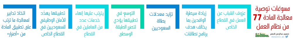 فيما حضرت الخشية من تزايد معدلات بطالة السعوديين وزيادة سيطرة العاملين غير السعوديين بما يخالف الهدف الأساسي لبرنامج نطاقات الذي أقرته وزارة العمل، مسوغا رابعا لتقديم التوصية، إضافة إلى خشية عزوف الشباب من الجنسين عن العمل في القطاع الخاص لما يترتب من تطبيق المادة 77، بما يتعارض مع برنامج التحول الوطني 2020 ورؤية المملكة 2030 التي يهدف كل منها إلى خلق بيئة عمل آمنة وجاذبة في القطاع الخاص بهدف ترشيد التوظيف الحكومي وتخفيف الأعباء على جهازه.
