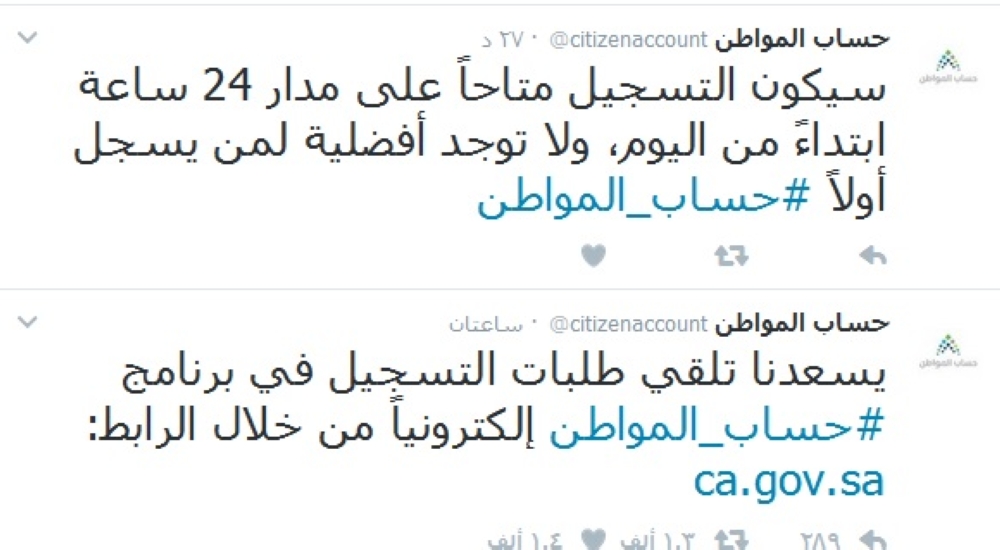 وأوضحت تغريدة على موقع «حساب المواطن» أنه «يسعدنا تلقي طلبات التسجيل في برنامج حساب_المواطن إلكترونياً، وسيكون التسجيل متاحاً على مدار 24 ساعة ابتداء من اليوم، ولا توجد أفضلية لمن يسجل أولاً».