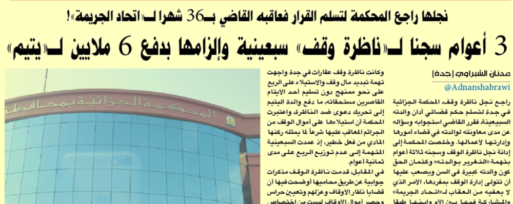 يذكر أن «عكاظ» نشرت الأربعاء الماضي خبرا عن محاكمة «ناظرة وقف» سبعينية في جدة بعد اتهامها بأكل مال يتيم، وشملت العقوبة نجلها الذي راجع المحكمة لتسلم القرار، فقرر القاضي سجنه 36 شهرا بحجة «اتحاد الجريمة بين الأم وولدها». وقضت المحكمة ذاتها بسجن محامٍ وعزله، موضحة في الحيثيات أن «الدفاع عن المعتدين خطر عظيم وذنب كبير»! وعاقبت المحكمة ذاتها محاميا تحت التمرين بالسجن بتهمة الكذب والتدليس.