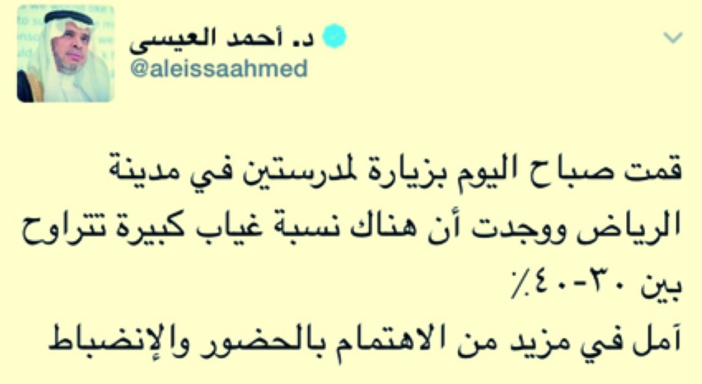 كشف وزير التعليم الدكتور أحمد العيسى عن رصده غياب طلاب مدرستين بالرياض بنسبة ٤٠٪. وقال عبر حسابه على تويتر أمس (الإثنين): «تفقدت مدرستين في مدينة الرياض ووجدت نسبة غياب كبيرة تتراوح بين ٣٠-٤٠٪، آمل في مزيد من الاهتمام بالحضور والانضباط». وأضاف العيسى: «لدي ثقة في دعم أولياء أمور الطلاب وزملائي المعلمين والمعلمات وقادة المدارس لمبدأ الانضباط المدرسي وحسن تقديرهم لأهميته مهما كانت الظروف».