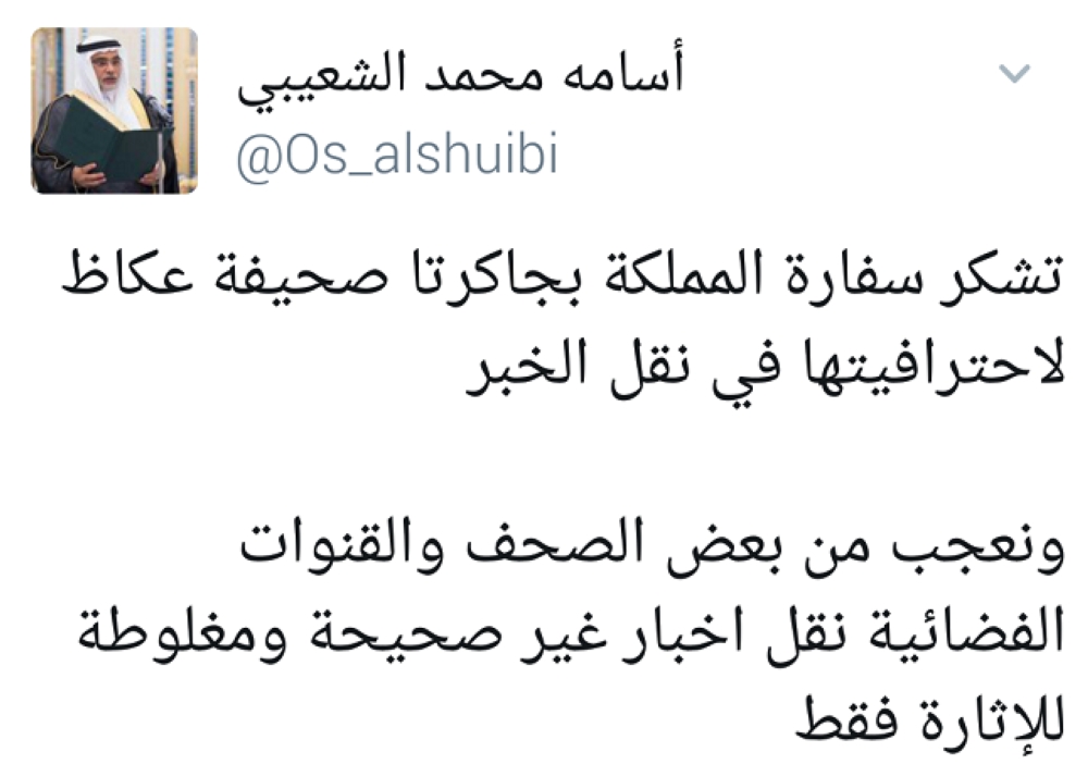 وجاء شكر السفير الشعيبي لـ"عكاظ" لالتزامها بالمعايير المهنية في نقل الخبر من المصدر الموثوق، حيث قال في تغريدته: "تشكر سفارة المملكة بجاكرتا صحيفة "عكاظ" لاحترافيتها في نقل الخبر، ونعجب من نقل بعض الصحف والقنوات الفضائية أخباراً غير صحيحة ومغلوطة للإثارة فقط".