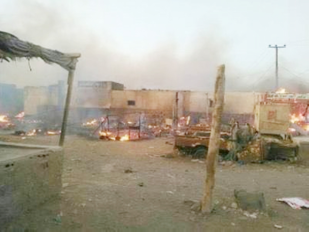 مبان أحرقتها الميليشيات الحوثية. (عكاظ)