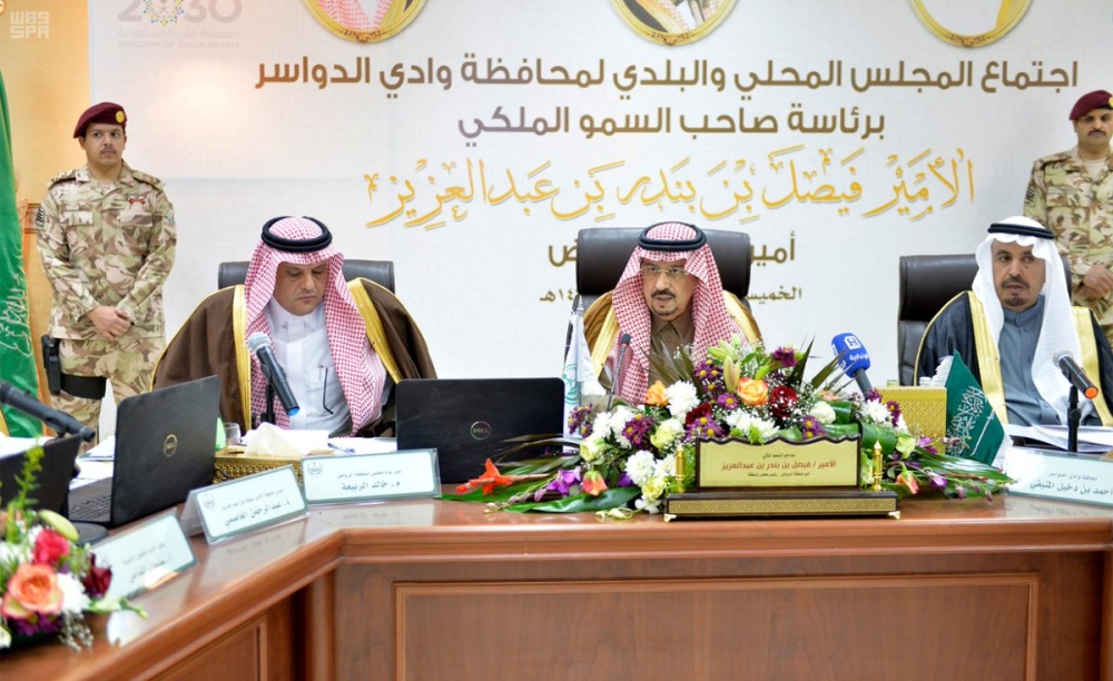 بعد ذلك توجه الأمير فيصل بن بندر إلى مقر المحافظة، حيث التقى رؤساء وقضاة المحاكم ورؤساء المراكز، ثم عقد اجتماعاً بأعضاء المجلسين البلدي والمحلي لمناقشة جداول الأعمال التي تتضمن احتياجات المحافظة حسب الأولوية، والاطلاع على العوائق التي تواجه المشروعات، فيما استمع من أعضاء المجالس إلى المرئيات والحلول والتطلعات واتخذت بشأنها التوصيات اللازمة، كما عقد اجتماعاً بالقيادات الأمنية بوادي الدواسر.