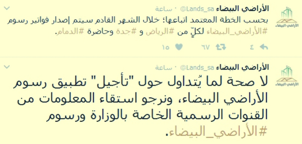 وقال في تغريدة اليوم (الجمعة) «لا صحة لما يُتداول حول «تأجيل» تطبيق رسوم الأراضي البيضاء، ونرجو استقاء المعلومات من القنوات الرسمية الخاصة بالوزارة ورسوم الأراضي البيضاء».