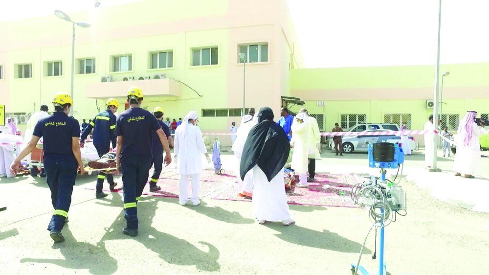 الدفاع المدني يخلي المستشفى أثناء تنفيذ الفرضية.