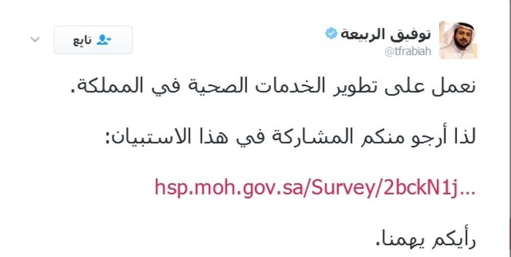 وقال الوزير في تغريدة نشرها اليوم (السبت) عبر حسابه على موقع التواصل الاجتماعي «تويتر»: «نعمل على تطوير الخدمات الصحية في المملكة؛ لذا أرجو منكم المشاركة في الاستبيان»، واختتم الربيعة طلبه بقوله: «رأيكم يهمنا».