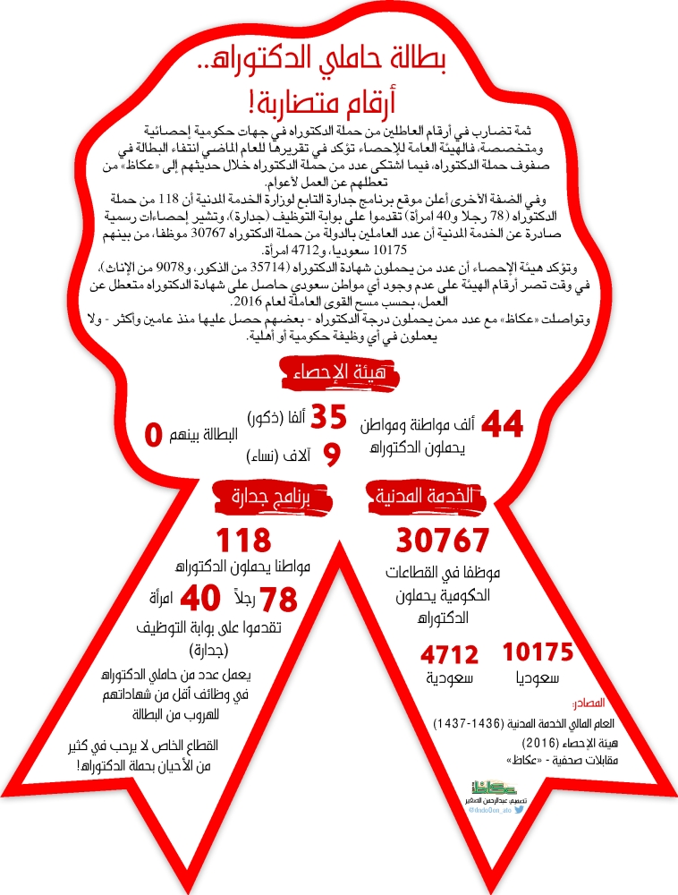 كشف إحصاء رسمي صادر عن وزارة الخدمة المدنية للعام المالي الماضي (1436-1437) عمل أكثر من 30 ألف موظف وموظفة من حملة درجة الدكتوراه في الوظائف الحكومية بنسبة لا تتجاوز 2.47 %، من بينهم 4712 دكتورة سعودية، و10175 دكتورا سعوديا.