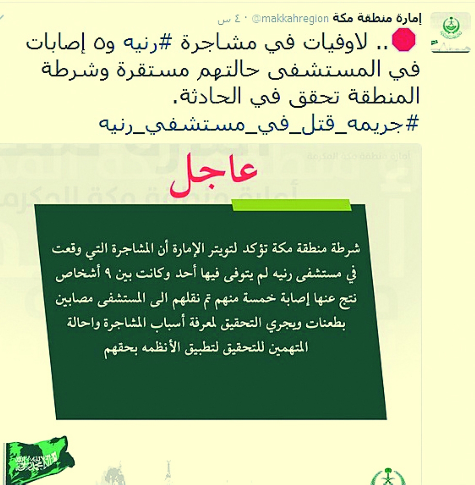 أعلنت شرطة منطقة مكة المكرمة، أنه لا وفيات في المشاجرة التي وقعت في مستشفى رنية، وأصيب على إثرها خمسة أشخاص. ونقلت إمارة منطقة مكة المكرمة، عن شرطة المنطقة قولها «إن أحداً لم يلق مصرعه في مشاجرة مستشفى رنية، التي اشترك فيها تسعة أشخاص، ونتجت عنها إصابة خمسة بطعنات».وأضافت على موقعها في «تويتر» أنه يجري حاليا التحقيق لمعرفة أسباب المشاجرة وإحالة المتهمين للتحقيق لتطبيق الأنظمة بحقهم.