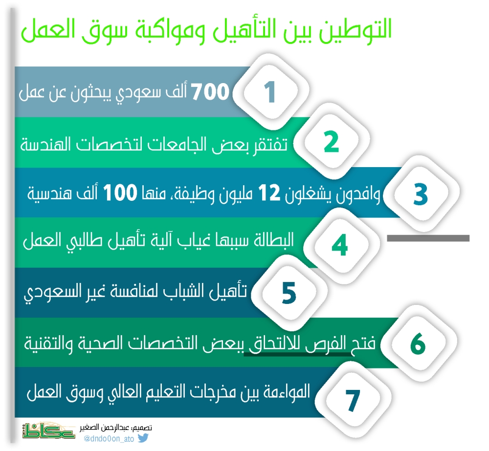 وأضاف: «هناك نحو 100 ألف وظيفة هندسية يشغلها غير السعوديين، وبالمقابل تفتقر بعض الجامعات لتخصصات الهندسة»، مشيراً إلى أن الوظائف الحكومية وفقا لرؤية المملكة 2030 لا ينتظر منها قبول خريجين جدد، بل على القطاع الخاص احتواؤهم، لأن سوق الاقتصاد السعودي لن تبنى إلا على يد أبنائها، لذا على القطاعات المسؤولة تدريب وتأهيل الشباب ليستطيعوا منافسة غير السعودي، فيما توظيف المرأة بالقطاع الخاص يواجه عقبات لعدم توفر بيئة مناسبة لها، ولا بد من إعادة العمل على جعل بيئة القطاع الخاص مناسبة.
