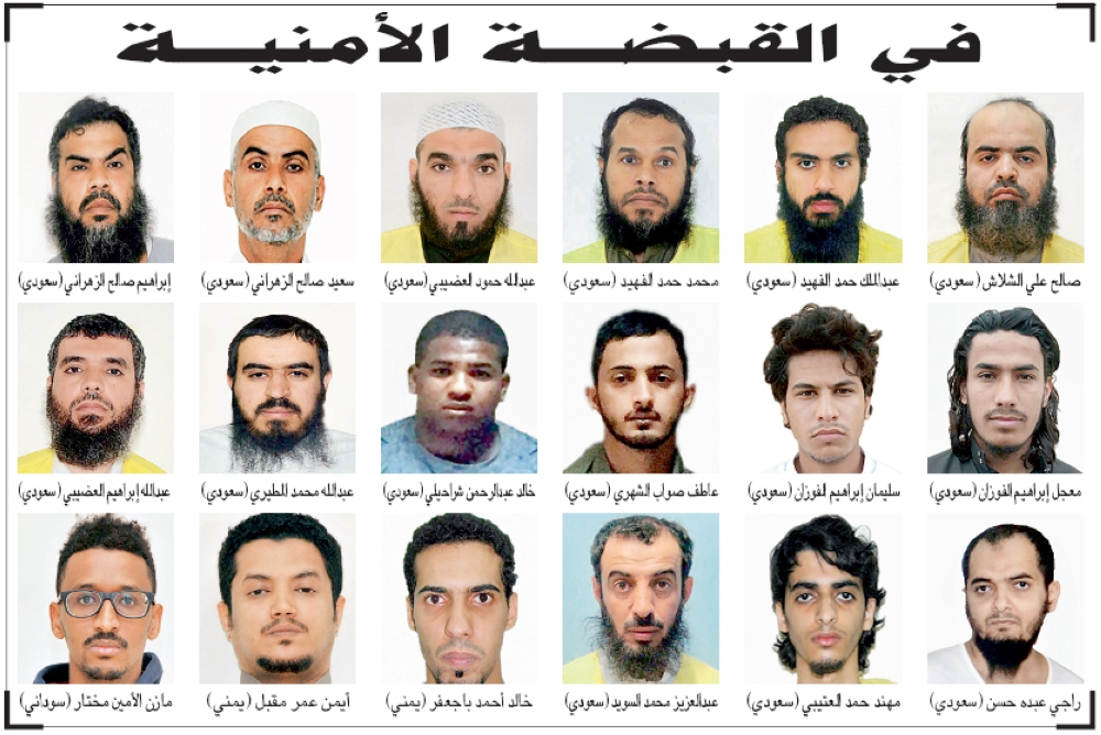1- إبراهيم صالح سعيد الزهراني -سعودي الجنسية. 2- خالد عبدالرحمن محمد شراحيلي -سعودي الجنسية. 3- راجي عبده علي حسن - سعودي بالتجنس. 4- سعيد صالح سعيد الزهراني - سعودي الجنسية. 5- سليمان إبراهيم عبدالرحمن الفوزان - سعودي الجنسية. 6- صالح علي عبدالرحمن الشلاش -سعودي الجنسية. 7- عاطف صواب ظافر الشهري - سعودي الجنسية. 8- عبدالعزيز محمد عبدالعزيز السويد - سعودي الجنسية. 9- عبدالله إبراهيم سليمان العضيبي - سعودي الجنسية. 10-عبدالله حمود عبدالله العضيبي - سعودي الجنسية. 11- عبدالله محمد الحميدي المطيري - سعودي الجنسية. 12- عبدالملك حمد عبدالله الفهيد - سعودي الجنسية. 13- محمد حمد سليمان الفهيد - سعودي الجنسية. 14- معجل إبراهيم عبدالرحمن الفوزان - سعودي الجنسية. 15- مهند حمد صلاح الزيادي العتيبي - سعودي الجنسية. 16- أيمن عمر أحمد مقبل -يمني الجنسية. 17- خالد أحمد محمد باجعفر-يمني الجنسية. 18- مازن الأمين مختار محمد -سوداني الجنسية. كما أسفرت العملية الأمنية عن ضبط عدد من الأسلحة الآلية، وأسلحة بيضاء ذات نوعية خطرة، إضافة إلى مبالغ مالية كبيرة تجاوزت مليوني ريال سعودي.