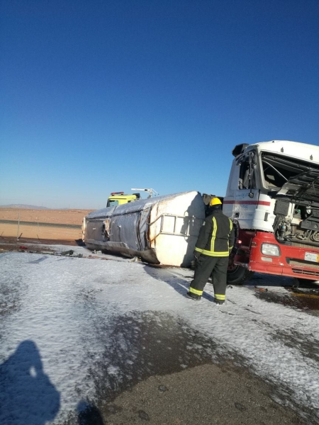وأوضح المتحدث باسم الدفاع المدني في منطقة المدينة المنورة العقيد خالد مبارك الجهني، أن فرق الدفاع المدني باشرت حادثة انقلاب الناقلة المحملة بالديزل واستخدمت الرغاوي نتيجة تسريب حمولة الناقلة بالكامل على الطريق، وفصلت البطاريات منعاً للاشتعال. ولفت إلى أن الحادثة نتجت عنها إصابة السائق الذي تم نقله إلى مستشفى الحناكية، فيما سلمت الحادثة إلى جهة الاختصاص لاستكمال الإجراءات النظامية.