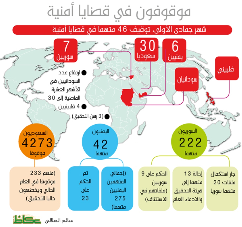شهد شهر جمادى الأولى حتى 17 منه توقيف 46 متهما في قضايا أمنية، يجري التحقق منها حاليا بواسطة جهات الاختصاص، منهم 30 سعوديا وستة من الجنسية اليمنية وسبعة سوريين وسودانيان وفلبيني.