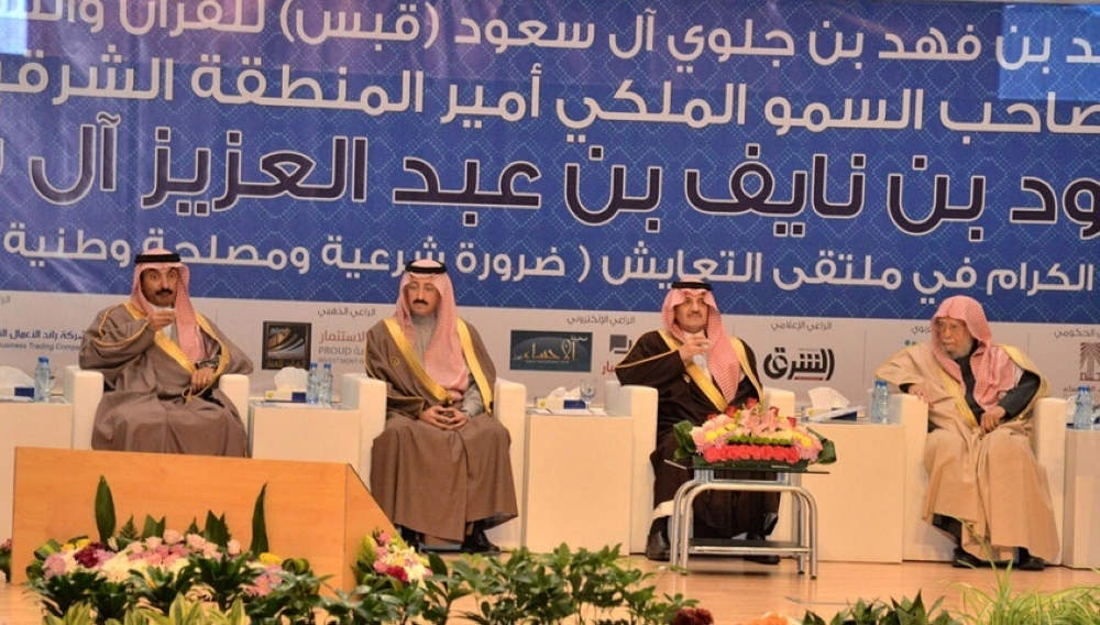 عقب ذلك ألقى المستشار بالديوان الملكي عضو هيئة كبار العلماء الشيخ الدكتور عبدالله بن عبدالمحسن التركي كلمة المشاركين في الملتقى، أثنى فيها على إقامة الملتقى الذي يؤكد نهج المملكة على الوسطية والتعايش منذ عهد الملك عبدالعزيز - رحمه الله -. إثر ذلك شاهد الحضور فيلماً وثائقياً بعنوان "موطن التعايش والسلام"، ثم ألقى معالي مدير جامعة الإمام محمد بن سعود الإسلامية الدكتور سليمان بن عبدالله أبا الخيل كلمة شركاء المؤسسة، أشاد فيها بمؤسسة الأمير محمد بن فهد بن جلوي للقرآن والسنة والخطابة والدور الذي تقدمه وإقامتها لهذا الملتقى، مبيناً أن التعايش بين البشر حاجة ماسة لاستمرار الحياة بالصورة التي يتأملها الجميع، وأن هذا التعايش هو مبدأ في المملكة منذ عهد المغفور له الملك عبدالعزيز وحتى عهد خادم الحرمين الشريفين الملك سلمان بن عبدالعزيز آل سعود - حفظه الله -. عقب ذلك ألقى صاحب السمو الملكي الأمير سعود بن نايف بن عبدالعزيز أمير المنطقة الشرقية كلمة أشاد فيها بهذا الملتقى الذي يقام تحت عنوان " التعايش.. ضرورة شرعية ومصلحة وطنية"، مؤكداً أنه جاء في وقت تشهد فيه الأمة الإسلامية والعربية وجود جماعات وأفراد يسعون لنشر الفتنة والتفرقة ويسعون لتشويه سماحة الإسلام وعدله فخيب الله مساعيهم ورد كيدهم في نحورهم بوعي أبناء وطننا وأمتنا وإدراكهم لمفهوم التعايش كما جاء في ديننا الحنيف. وأضاف سموه "إن التعايش أمر رباني وفطرة الإنسان السوي ولاشك أن شمس مبادرات بلادنا في مجال التعايش لا يحجبها غربال المشككين فلقد استشعرت القيادة الرشيدة - أيدها الله - منذ نشأتها أهمية غرس مفهوم التعايش ونبذ التفرقة فجعلت المواطنين سواء في حقوقهم ويجمعهم حق المواطنة كما قدمت هذه البلاد ولله الحمد مجموعة من المبادرات على المستوى الوطني والدولي فأنشأت مركز الملك عبدالعزيز للحوار الوطني لتعزيز اللحمة الوطنية والتعايش بين أبناء مجتمعنا وأنشأت كذلك مركز الملك عبدالله للحوار بين أتباع الأديان والثقافات".