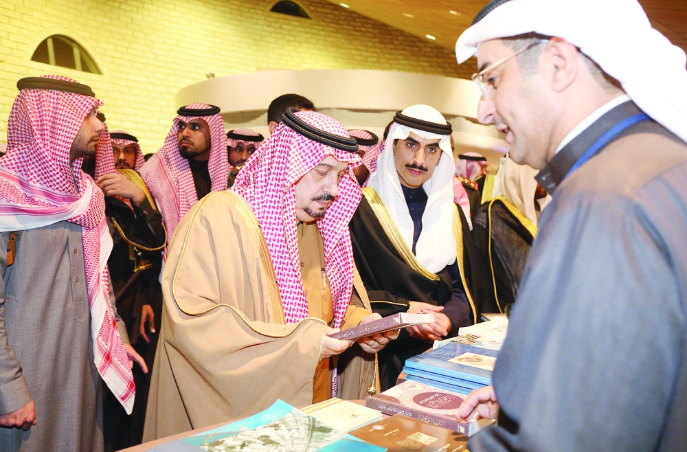 الأمير فيصل بن بندر يطلع على كتب تحكي مسيرة الكويت. (عكاظ)