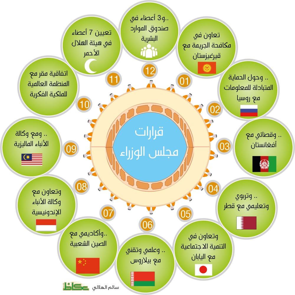 * الموافقة على اتفاق تعاون في مجال مكافحة الجريمة بين حكومة المملكة العربية السعودية وحكومة جمهورية قيرغيزستان، الموقع في مدينة جدة بتاريخ 18 / 8 / 1437.. وأُعد مرسوم ملكي بذلك.