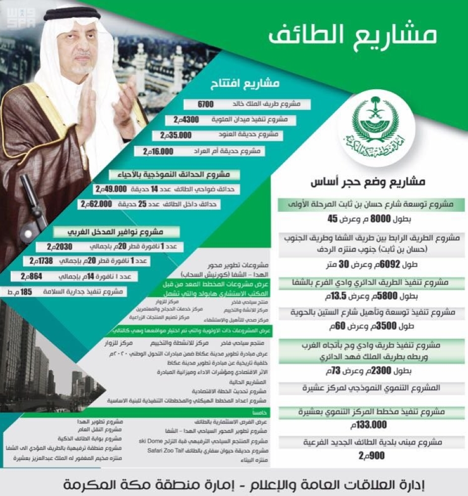كما يضع أمير منطقة مكة المكرمة، حجر الأساس لعدد من المشروعات الكبرى بالطائف الجديد، ويفتتح عددا آخر من مشروعات أمانة محافظة الطائف، ومنها مشروعات دوار المئوية، وطريق الملك خالد، وحديقة العنود، وحديقة أم العراد، ومشروعات حدائق في مختلف أنحاء المحافظة.