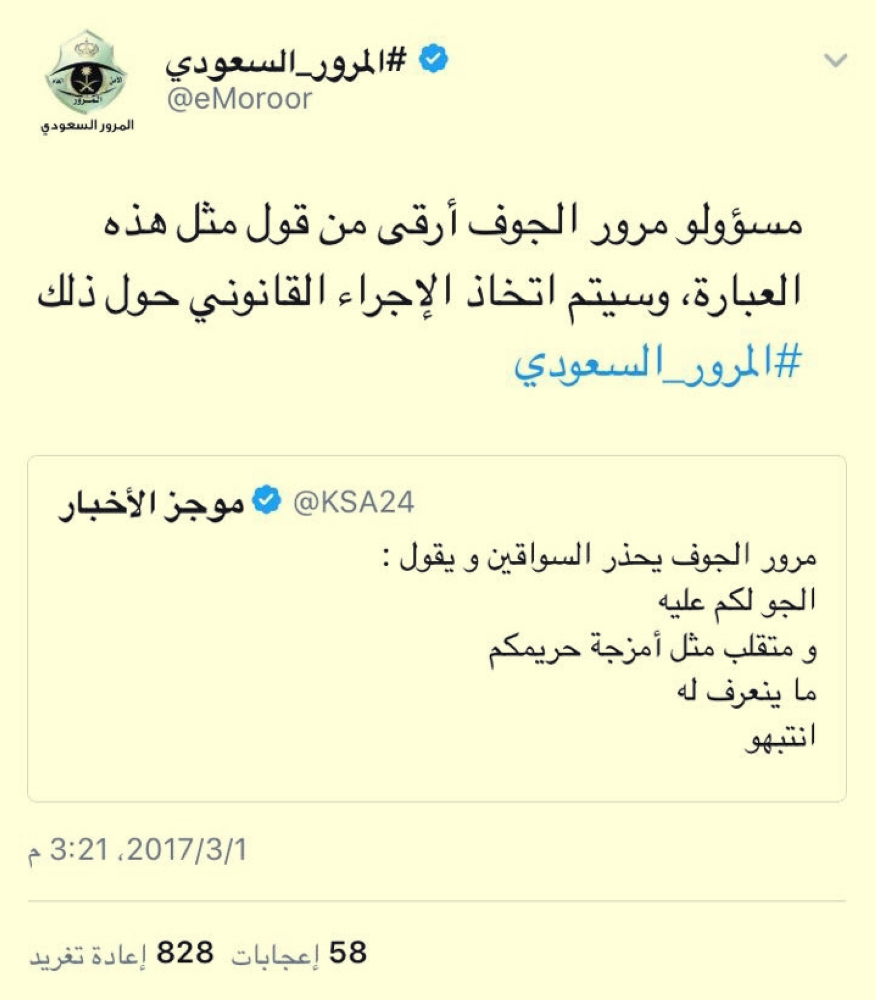 توعدت الإدارة العامة للمرور عبر حسابها في «تويتر» أحد الحسابات الإخبارية على تويتر، باتخاذ إجراءات قانونية ضده لنشره تغريدة نسبها إلى مرور منطقة الجوف، ذكر فيها «مرور الجوف يحذر السواقين ويقول: الجو لكم عليه ومنقلب مثل أمزجة حريمكم ما ينعرف له انتبهوا»، ونشر المرور عبر حسابه الرسمي على تويتر ردا على التغريدة ووصفها بغير اللائقة، قال فيها «إن مسؤولي مرور الجوف أرقى من قول مثل هذه العبارة، وسيتم اتخاذ الإجراء القانوني حول ذلك».