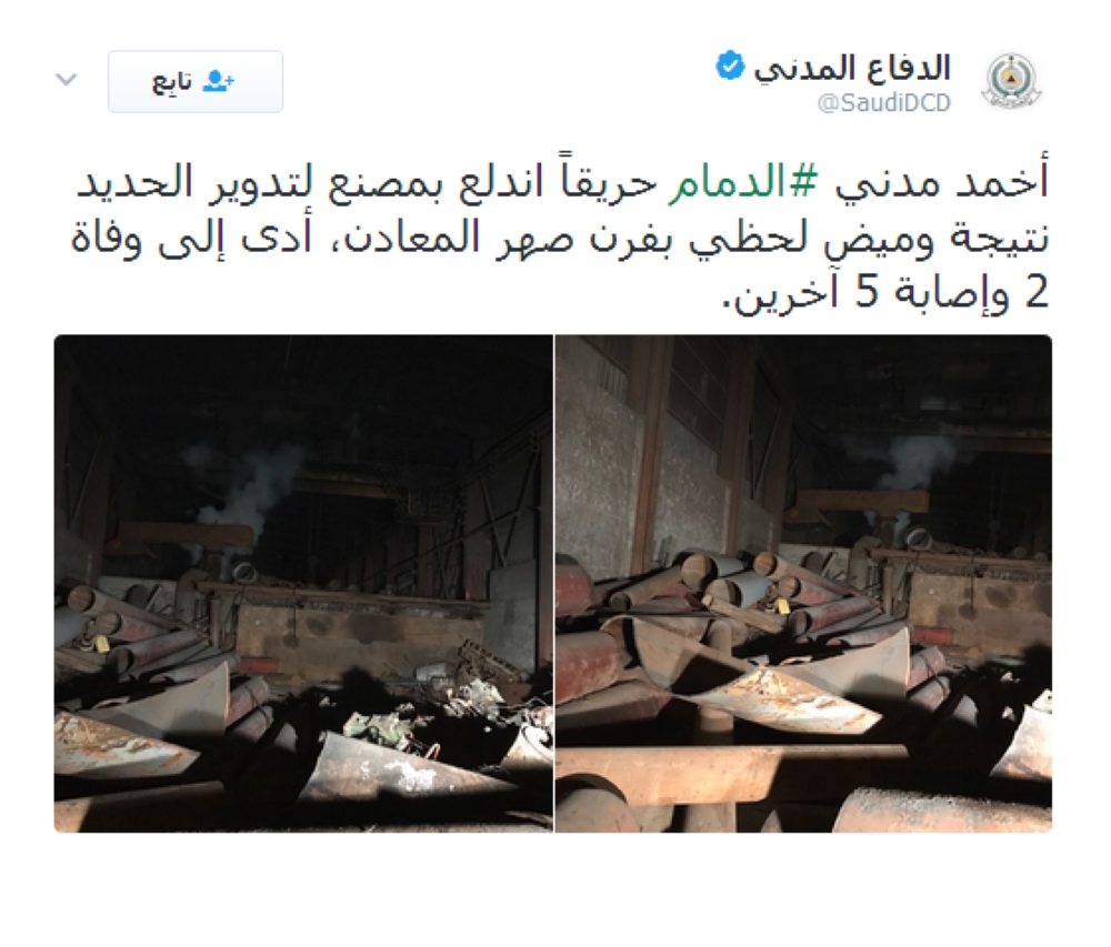 أعلنت الإدارة العامة للدفاع المدني عبر حسابها على موقع التواصل الاجتماعي "تويتر" أن فرق الدفاع المدني بالدمام أخمدت حريقاً اندلع بمصنع لتدوير الحديد نتيجة وميض لحظي بفرن صهر المعادن، أدى إلى وفاة 2 وإصابة 5 آخرين.
