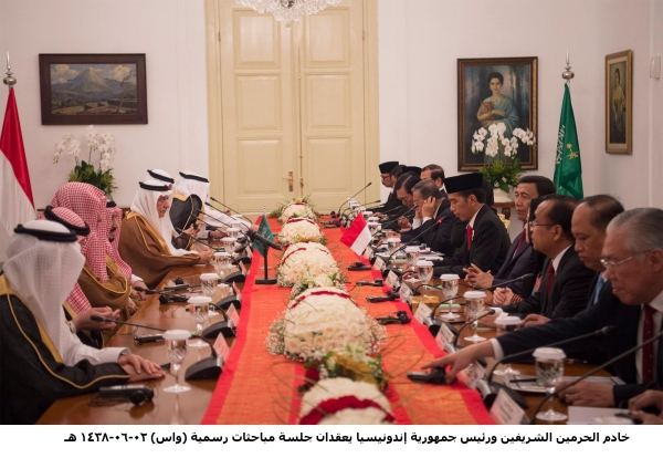 من جهته، جدد الرئيس الإندونيسي الترحيب بخادم الحرمين الشريفين في إندونيسيا، واصفاً هذه الزيارة بالتاريخية، وأكد عمق العلاقات القائمة بين المملكة وإندونيسيا، وحرص بلاده على تعزيزها وتنميتها في مختلف المجالات بما يحقق المصالح المشتركة للشعبين الشقيقين، وأشار إلى استعداد بلاده بأن تكون شريكاً إستراتيجياً للمملكة في تحقيق أهداف رؤية المملكة 2030.