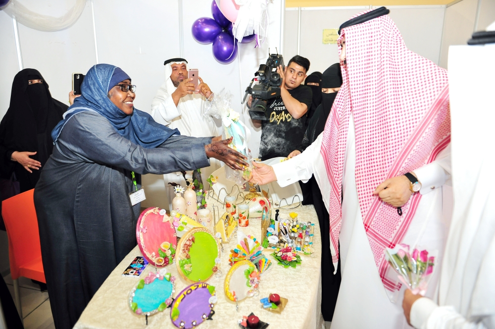 مستفيدة من الضمان تهدي مدير فرع وزارة العمل والتنمية الاجتماعية بعض أعمالها. (تصوير: أحمد القحطاني)