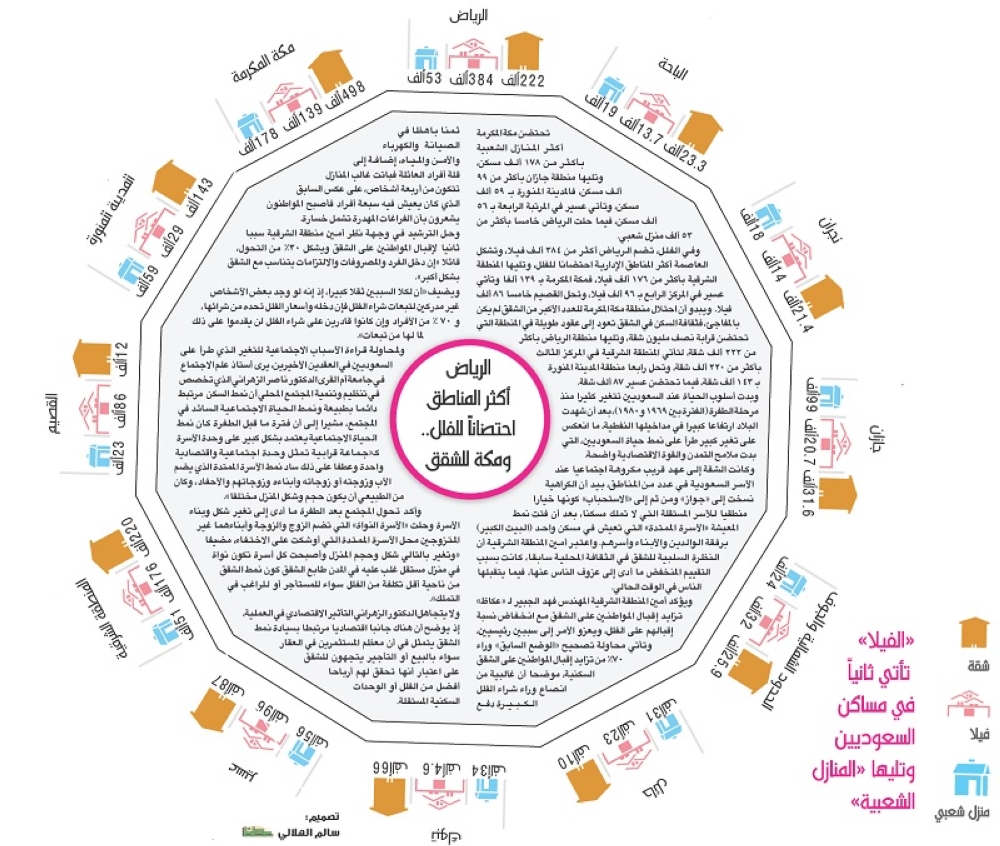 وفي الفلل، تضم الرياض أكثر من 384 ألف فيلا، وتشكل العاصمة أكثر المناطق الإدارية احتضانا للفلل، وتليها المنطقة الشرقية بأكثر من 176 ألف فيلا، فمكة المكرمة بـ 139 ألفـا وتأتي عسير في المركز الرابع بـ 96 ألف فيلا، وتحل القصيم خامسا 86 ألف فيلا. ويبدو أن احتلال منطقة مكة المكرمة للعدد الأكبر من الشقق لم يكن بالمفاجئ، فثقافة السكن في الشقق تعود إلى عقود طويلة في المنطقة التي تحتضن قرابة نصف مليون شقة، وتليها منطقة الرياض بأكثر من 222 ألف شقة، لتأتي المنطقة الشرقية في المركز الثالث بأكثر من 220 ألف شقة، وتحل رابعا منطقة المدينة المنورة بـ 143 ألف شقة، فيما تحتضن عسير 87 ألف شقة.