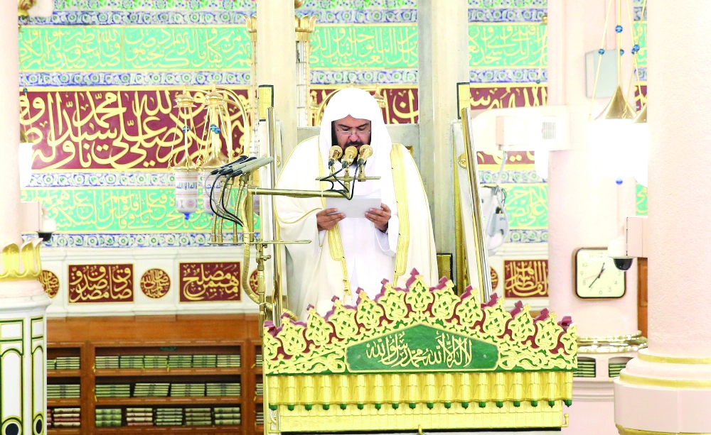 السديس يلقي خطبة الجمعة أمس في المسجد النبوي الشريف. (عكاظ)