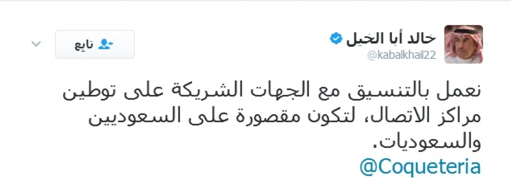وقال ابا الخيل عبر حسابه في "تويتر": "نعمل بالتنسيق مع الجهات الشريكة على توطين مراكز الاتصال، لتكون مقصورة على السعوديين والسعوديات".