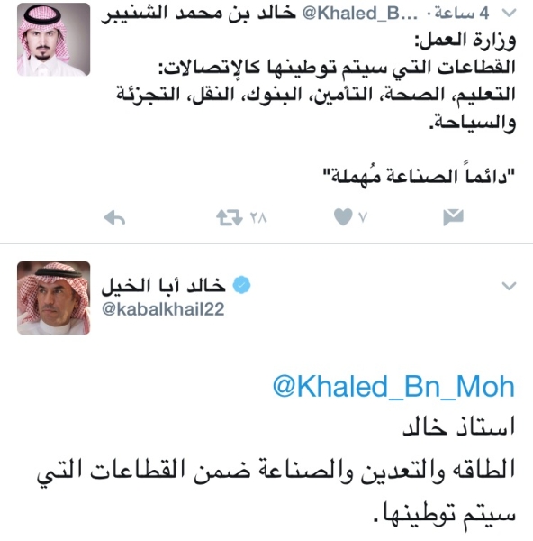 من جهة آخرى كشف أبا الخيل أن قطاعات الطاقة، والتعدين، والصناعة ومراكز الاتصالات ستكون من ضمن أجندة وزارة «العمل» التي ستستهدفها بالتوطين.