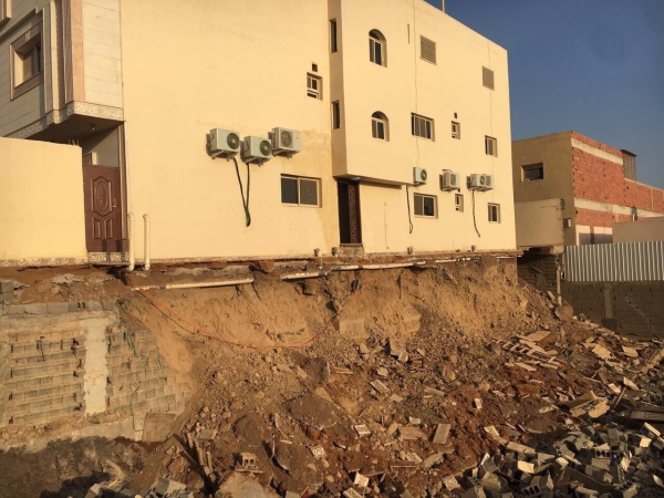وأوضح المتحدث باسم للدفاع المدني بالمنطقة العقيد خالد الجهني، أن بلاغاً ورد عن حادثة انهيار سور خارجي لعمارة سكنية بمخطط شوران، وعلى الفور توجهت الفرق إلى الموقع وعند الوصول اتضح انهيار السور نتيجة أعمال حفر الأرض المجاورة، وتم إخلاء العمارة من السكان احترازيا وطلب لجنة المباني الآيلة للسقوط للوقوف على المبنى حسب الاختصاص.