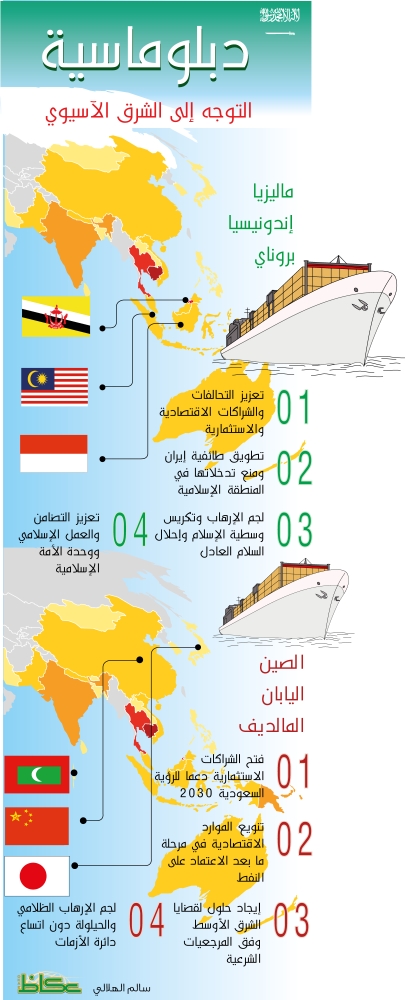 انقضت ثلاث محطات مهمة في جولة خادم الحرمين الشريفين الملك سلمان بن عبدالعزيز الآسيوية، في إطار دبلوماسية التوجه إلى الشرق التي انطلقت بماليزيا فإندونيسيا ثم بروناي، وستعقبها زيارة كل من اليابان والصين والمالديف، وتختتم بالأردن، إذ يرأس الملك سلمان الوفد السعودي في القمة العربية، هذه الدبلوماسية نجحت في تعزيز التضامن وتطويق الإرهاب وتكريس وسطية الإسلام وإحلال السلام، وكذلك طائفية إيران ومنع تدخلاتها في الشؤون الخليجية العربية والإسلامية.