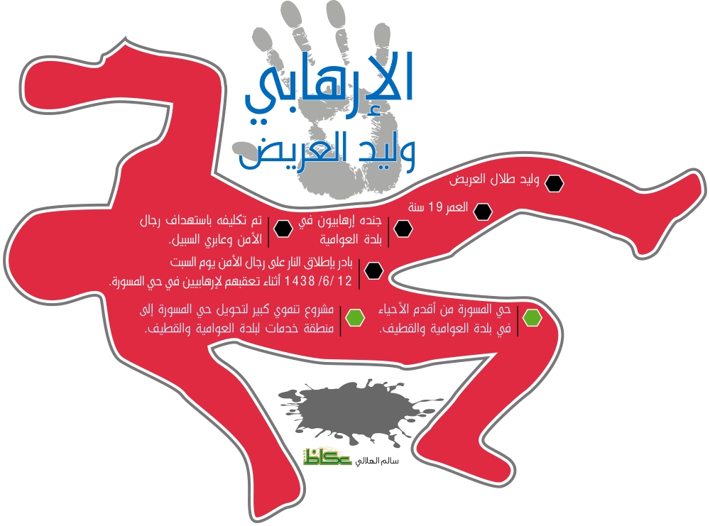 كشف المتحدث الأمني باسم وزارة الداخلية اللواء منصور التركي لـ«عكاظ» أن المطلوب الأمني الهالك وليد العريض تم تجنيده من قبل عناصر إرهابية ليؤدي عدة أدوار إجرامية في بلدة العوامية والقطيف. وأضاف المتحدث أن وليد العريض من العناصر المجندة والمدربة على استخدام الأسلحة لاستهداف رجال الأمن وهم يؤدون مهماتهم ببلدة العوامية، إضافة لاستهداف عابري السبيل بالبلدة، والمشاركة في تنفيذ عمليات إرهابية، وهو من مواليد شهر رجب سنة 1420.