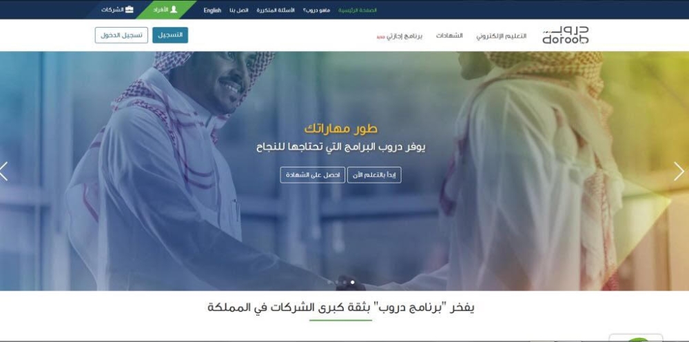 وتهدف منصة دروب https://www.doroob.sa إلى تطوير مهارات مليون مستفيد ومستفيدة بحلول 2020، تمّ تحقيق 218 ألفاً منها في عام 2016م.