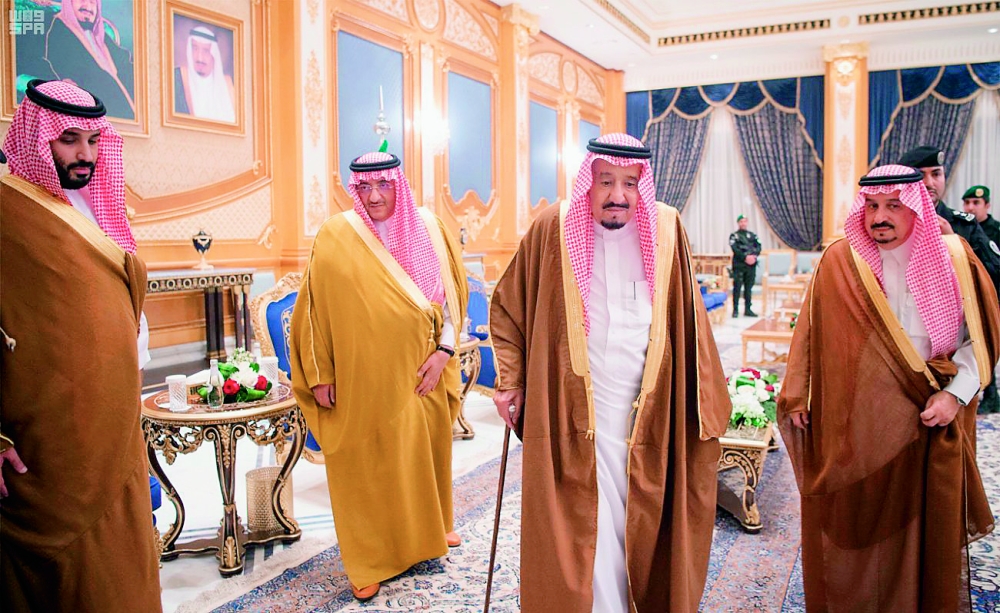 وكان في استقبال خادم الحرمين الشريفين عند سلم الطائرة فور وصوله إلى مطار قاعدة الملك سلمان الجوية بالقطاع الأوسط، الأمراء بندر بن عبدالعزيز، مستشار خادم الحرمين الشريفين عبدالإله بن عبدالعزيز، مقرن بن عبدالعزيز، أمير منطقة الرياض فيصل بن بندر بن عبدالعزيز، رئيس الهيئة العامة للسياحة والتراث الوطني سلطان بن سلمان بن عبدالعزيز، ولي العهد نائب رئيس مجلس الوزراء وزير الداخلية محمد بن نايف بن عبدالعزيز، أمير منطقة المدينة المنورة فيصل بن سلمان بن عبدالعزيز، ولي ولي العهد النائب الثاني لرئيس مجلس الوزراء وزير الدفاع محمد بن سلمان بن عبدالعزيز، تركي بن محمد بن فهد بن عبدالعزيز، سلمان بن سلطان بن سلمان بن عبدالعزيز، عبدالمجيد بن عبدالإله بن عبدالعزيز، وفيصل بن أحمد بن سلمان بن عبدالعزيز.