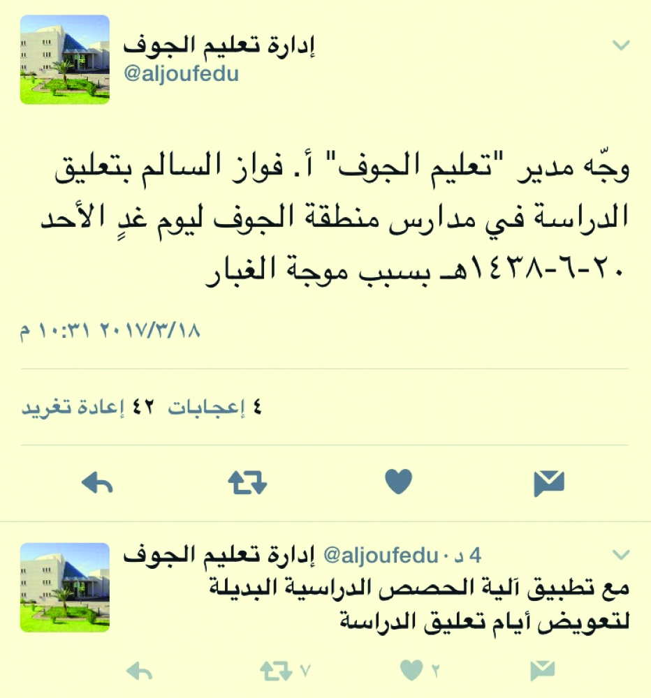 وقالت الإدارة عبر حسابها على موقع التواصل الاجتماعي «تويتر»: «وجّه مدير تعليم الجوف فواز السالم بتعليق الدراسة في مدارس منطقة الجوف اليوم (الأحد) بسبب موجة الغبار، مع تطبيق آلية الحصص الدراسية البديلة لتعويض أيام تعليق الدراسة».