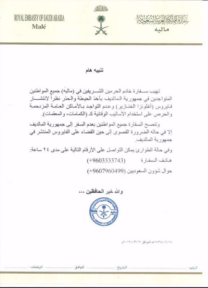 حذرت سفارة خادم الحرمين الشريفين في "مالية" جميع المواطنين الموجودين في جمهورية المالديف بأخذ الحيطة والحذر نظرا لانتشار فايروس (إنفلونزا الخنازير) وعدم الوجود بالأماكن العامة المزدحمة والحرص على استخدام الأساليب الوقائية كـ(الكمامات، والمعقمات). ونصحت السفارة جميع المواطنين بعدم السفر إلى جمهورية المالديف إلا في حالة الضرورة القصوى إلى حين القضاء على الفايروس المنتشر في جمهورية المالديف.