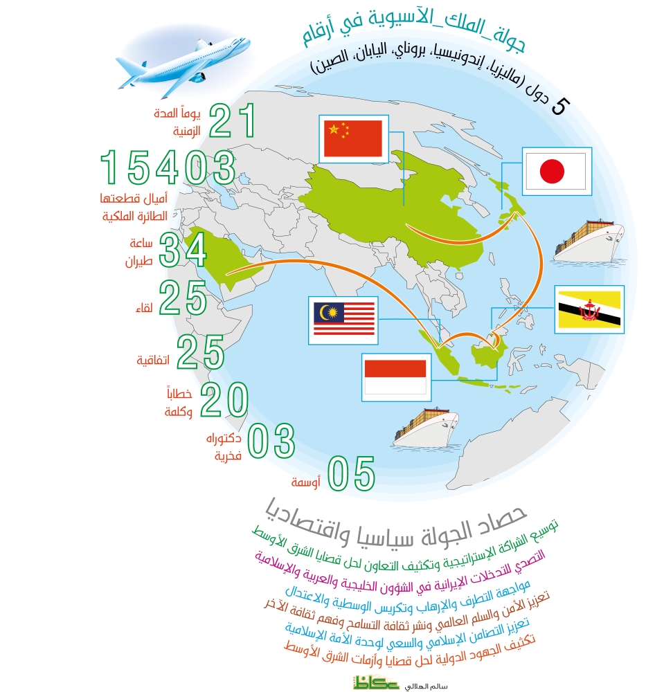 نجحت دبلوماسية التوجه إلى الشرق الآسيوي التي اختتمها خادم الحرمين الشريفين الملك سلمان بن عبدالعزيز، أمس الأول (السبت)، وتضمنت زيارة ماليزيا وإندونيسيا وبروناي واليابان والصين، في تعزيز الشراكات الإستراتيجية في ملف مكافحة الإرهاب وتكريس وسطية الإسلام، وإيجاد حلول عادلة لقضايا الشرق الأوسط، وفق المرجعيات والقرارات الدولية، ودعم ثقافة الاعتدال والتسامح، إضافة إلى تحجيم النفوذ الإيراني ومنع التمدد الطائفي الذي يقوده نظام الملالي في منطقة الشرق الأوسط، والعمل على تعزيز الأمن والسلم العالمي، فضلا عن تقوية التحالفات الاستثمارية والاقتصادية والنفطية والتجارية دعما لرؤية السعودية 2030 والتقليل من الاعتماد على النفط وتنويع موارد الاقتصاد السعودي.