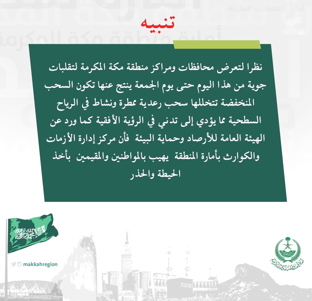 وأوضح المركز أن محافظات ومراكز منطقة مكة المكرمة تتعرض لتقلبات جوية بدأت من أمس (الأربعاء) ويستمر حتى غد (الجمعة) تصاحبها السحب المنخفضة الرعدية وتدني الرؤية الأفقية ما يستوجب الحذر.